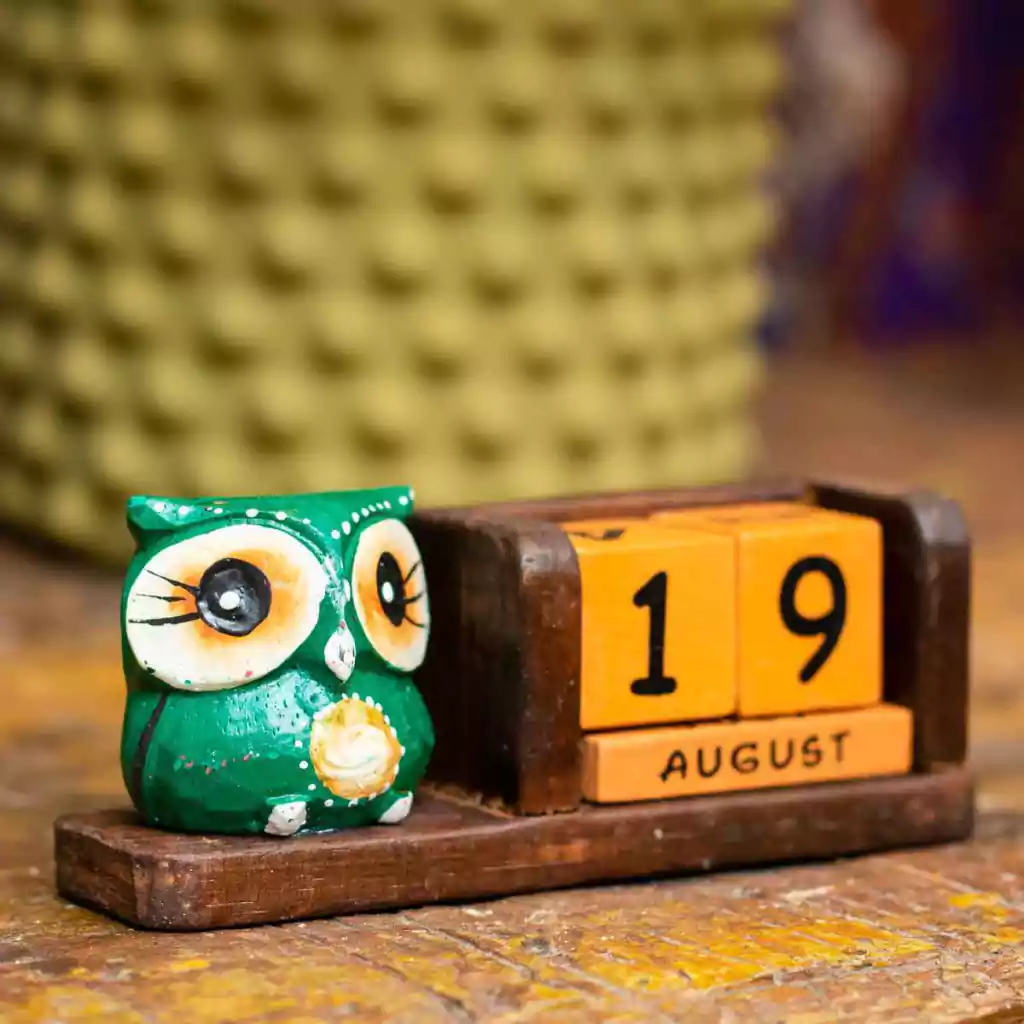 Calendário Coruja Verde de Madeira Balsa Importado de Bali