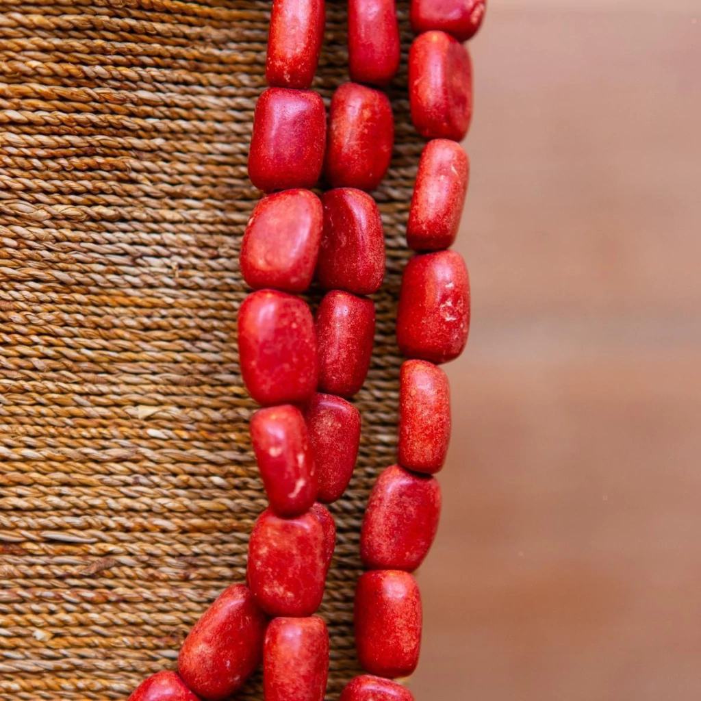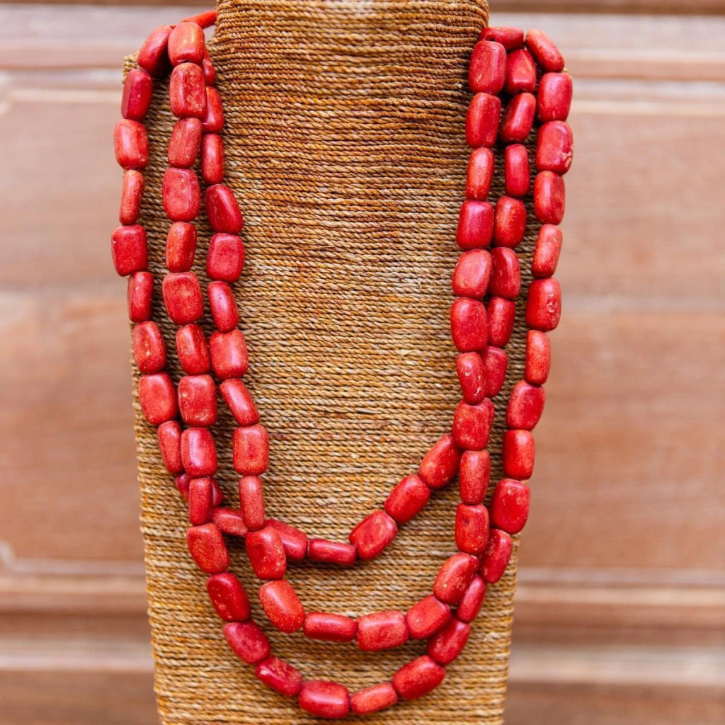 O colar indiano de resina destaca-se por suas cores vibrantes e design artesanal. Use-o para complementar looks estampados.