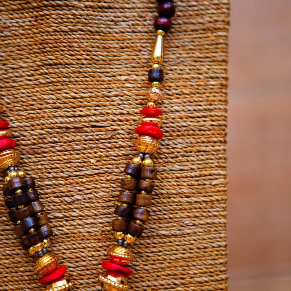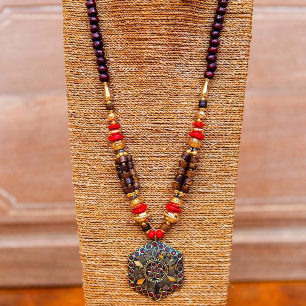 O colar indiano de madeira e metal celebra a beleza do artesanato. A mistura de materiais naturais e metálicos cria um visual único. Este acessório adiciona estilo e elegância, realçando qualquer visual com um toque de história e cultura.