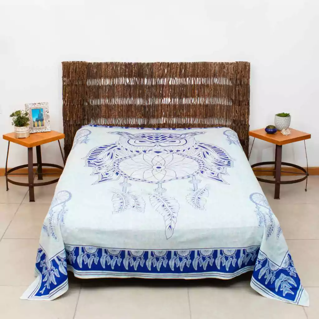 Colcha Indiana Casal Coruja Filtro dos Sonhos 100% Algodão Azul & Branco