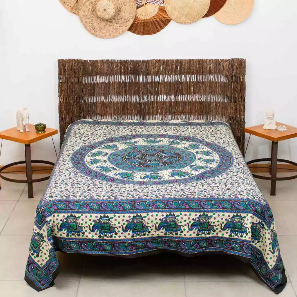 Colcha Indiana Casal Mandala Elefantes 100% Algodão Lilás & Cores