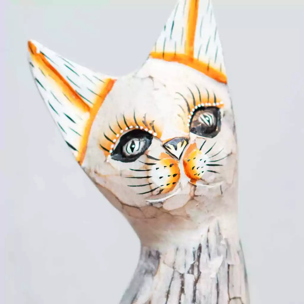 O gato simboliza a indepedência, a sabedoria, a sensualidade, a sagacidade e o equilíbrio. Além disso representa a fusão do espiritual e do físico. É uma excelente peça para se ter em casa para complementar a decoração. Nossa escultura é feita em madeira balsa e pintada à mão. É uma peça delicada e ao mesmo tempo marcante. Sua casa ou escritório vai ficar ainda mais bonito com a nossa escultura.