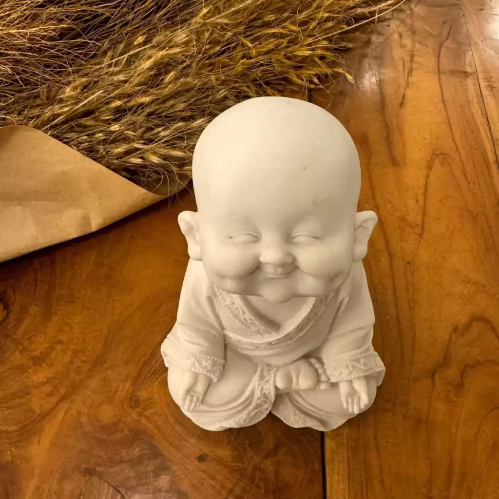 Escultura Monge Sorridente de Pó de Mármore Branco 18.5cm