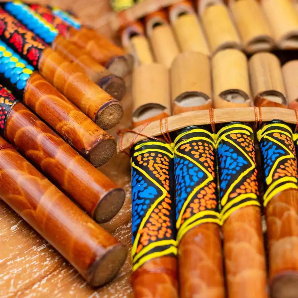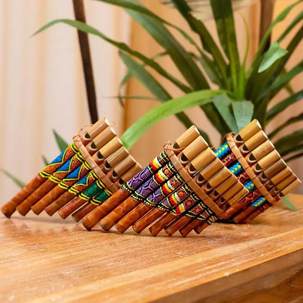 A Flauta de Pã Balinesa possui 8 tubos e é feita de bambu. Ela pode, também, ser usada como peça decorativa.