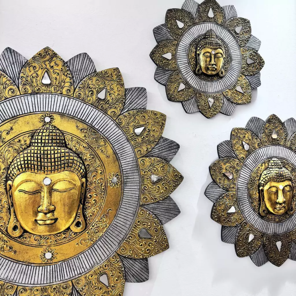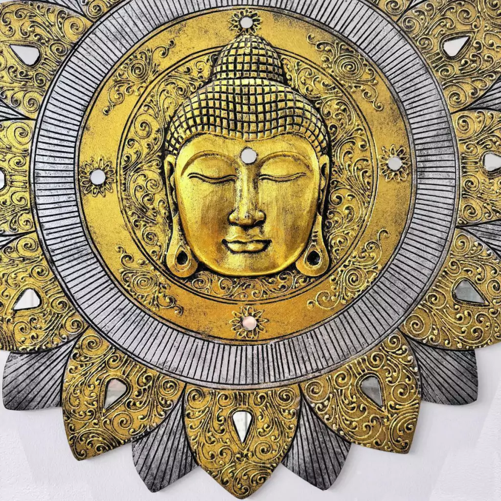 Mandala Buda de Madeira Balsa Ouro Velho & Espelhos