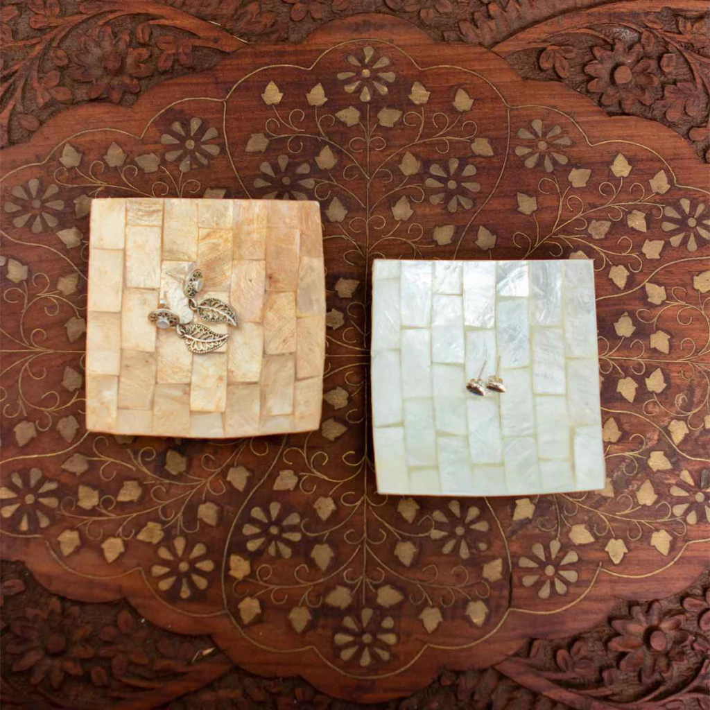 A madrepérola é uma substância dura, irisada, rica em calcário, produzida por alguns moluscos no interior de suas conchas. É uma matéria prima muito utilizada na confecção de acessórios e peças de decoração. Nosso porta jóias de madrepérola é um item elegante para colocar seus brincos e anéis no fim do dia.. Adquira o seu e leve charme para o seu lar ou escritório.