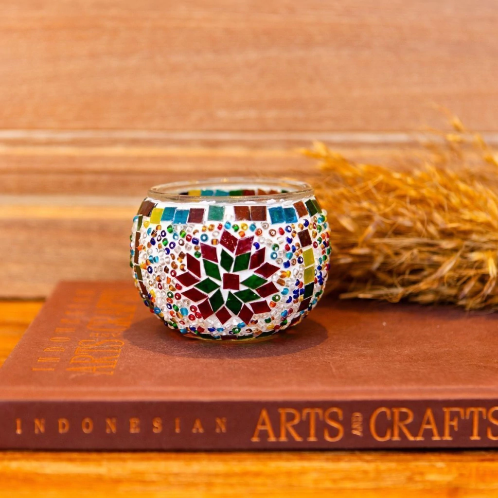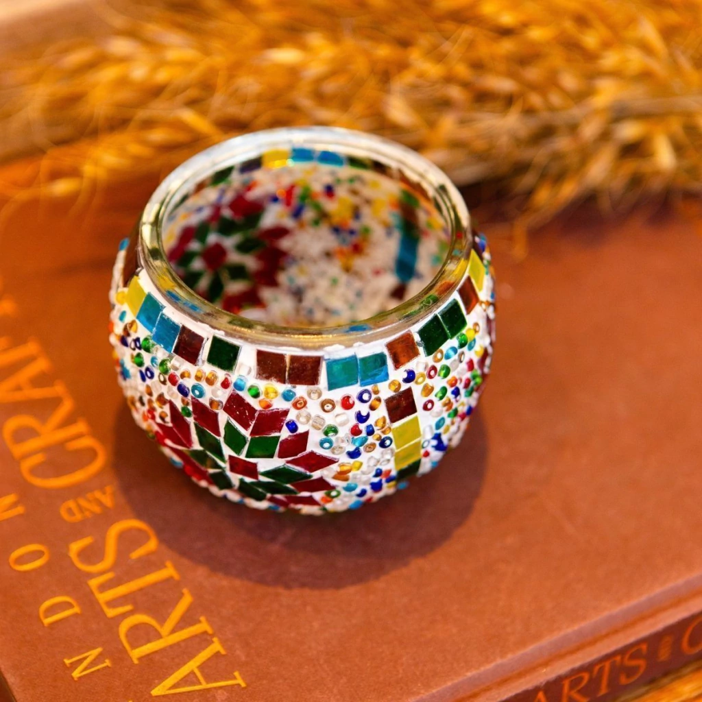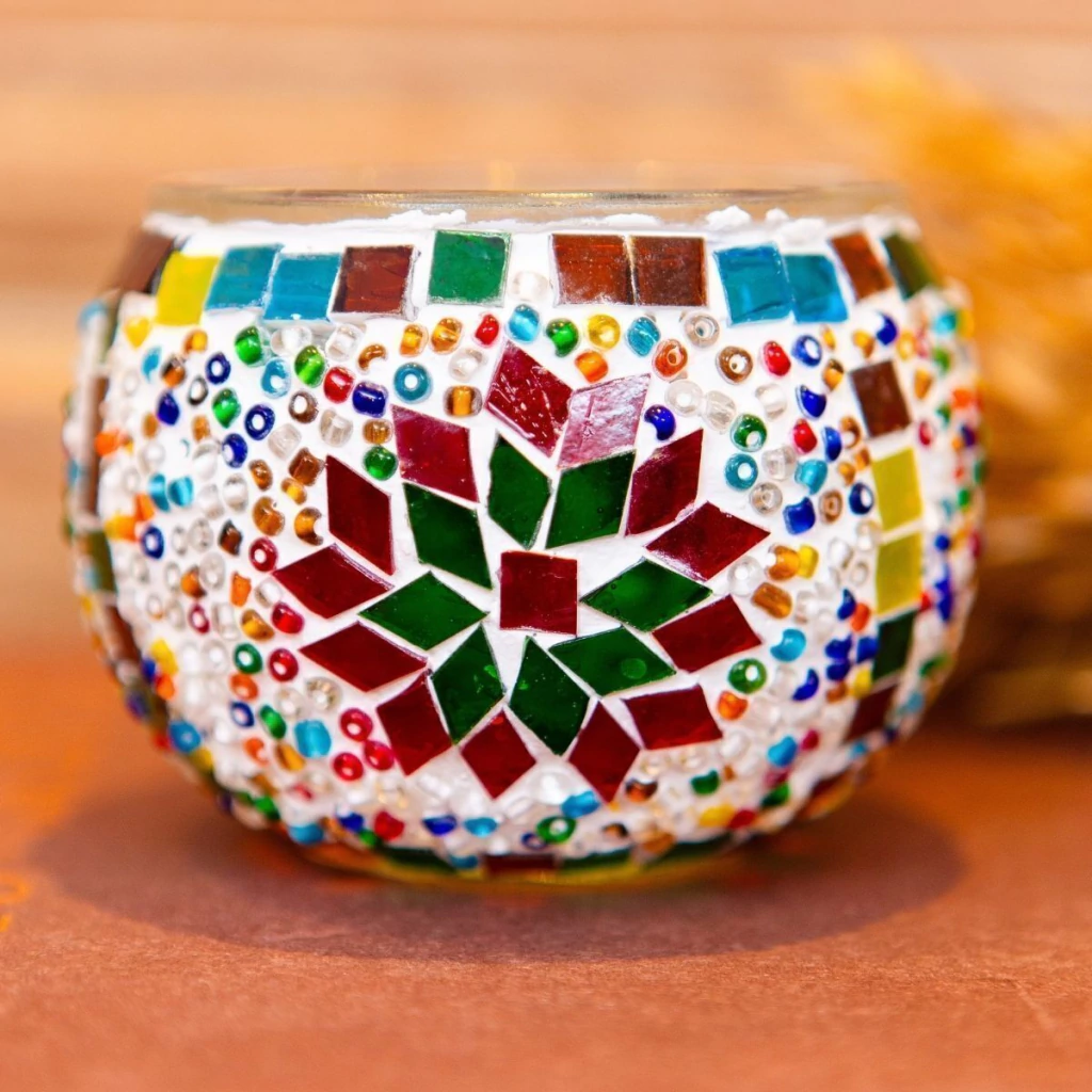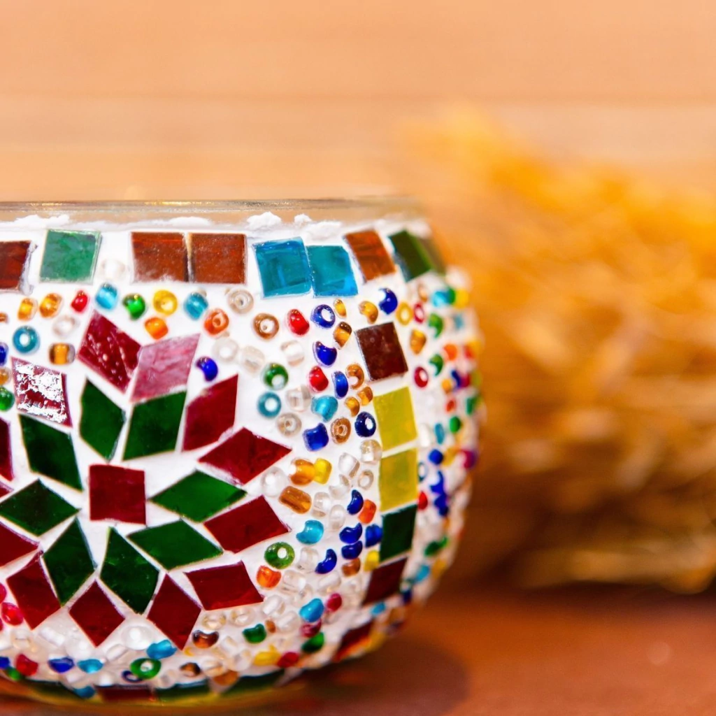 Os porta-velas mosaico são peças artesanais que combinam beleza e funcionalidade. Criados com pequenos fragmentos de vidro, cerâmica ou outros materiais, colados sobre uma base, formam desenhos vibrantes. A luz da vela, ao passar pelas frestas, cria um efeito luminoso único, ideal para ambientes aconchegantes. Na decoração, adicionam um toque de cor e elegância a mesas, estantes e nichos.