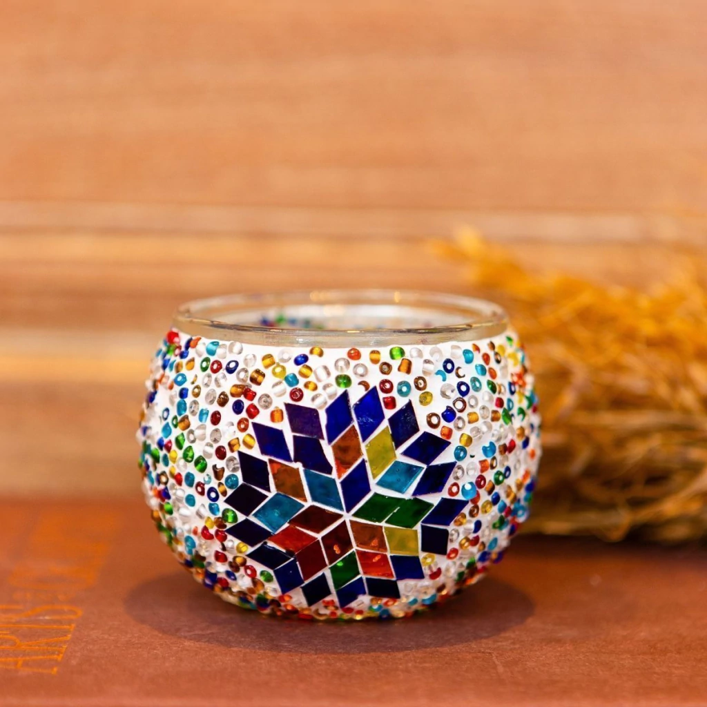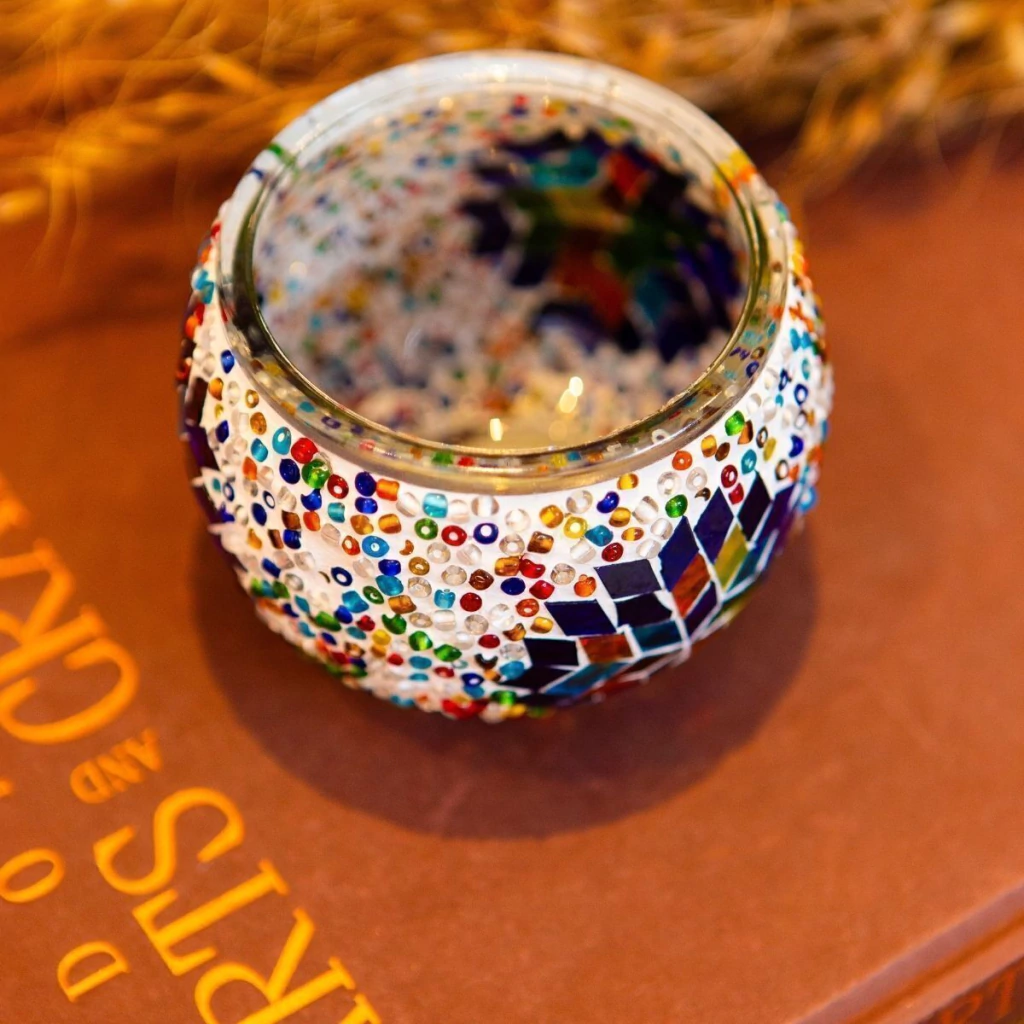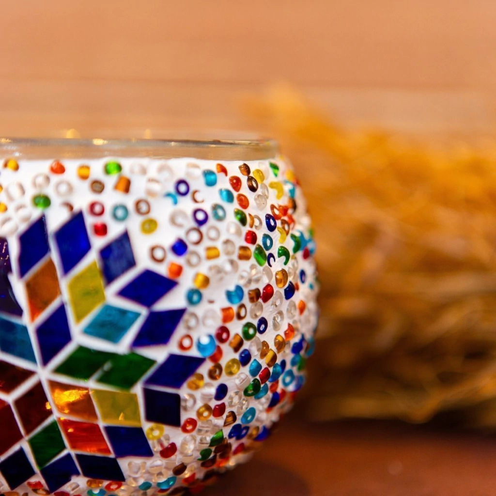 Os porta-velas mosaico são peças artesanais que combinam beleza e funcionalidade. Criados com pequenos fragmentos de vidro, cerâmica ou outros materiais, colados sobre uma base, formam desenhos vibrantes. A luz da vela, ao passar pelas frestas, cria um efeito luminoso único, ideal para ambientes aconchegantes. Na decoração, adicionam um toque de cor e elegância a mesas, estantes e nichos.